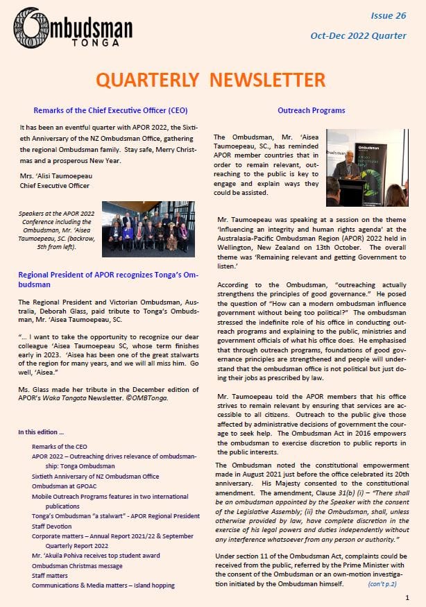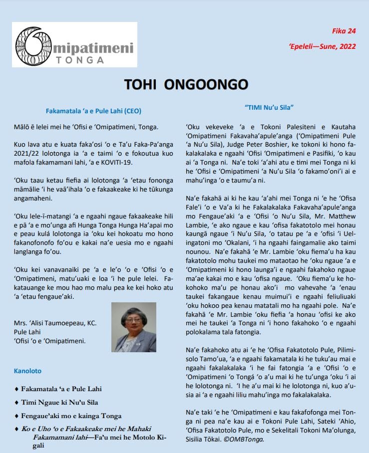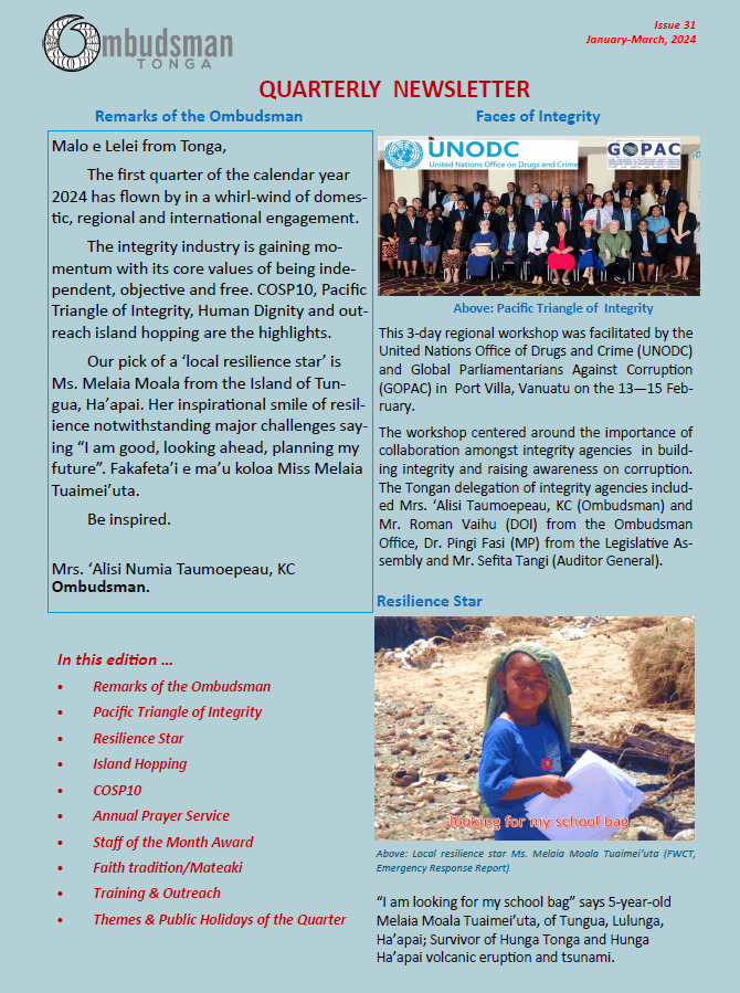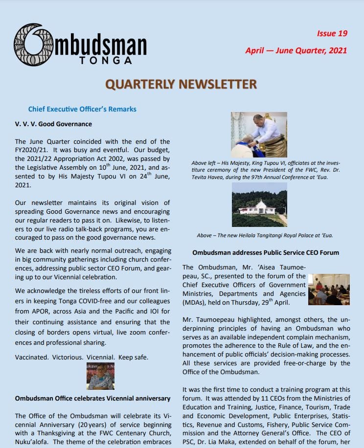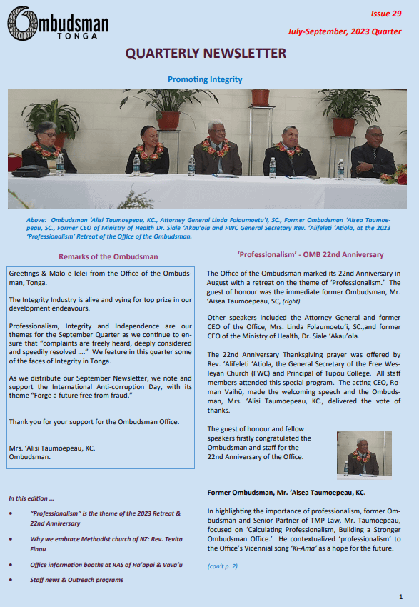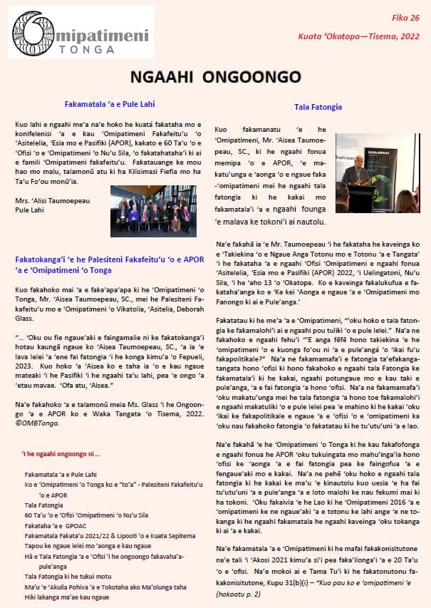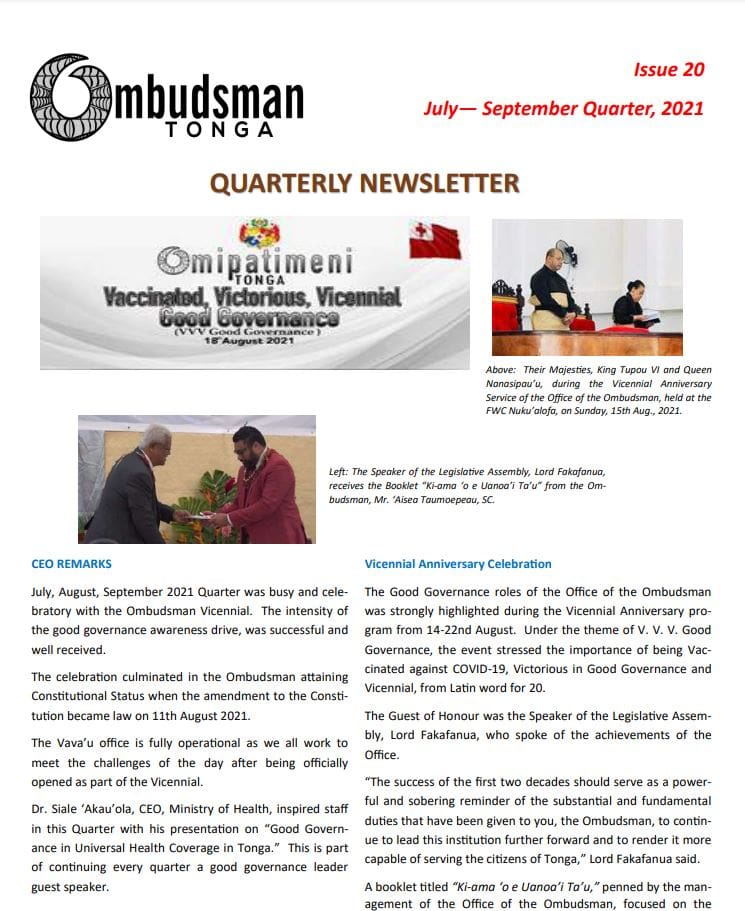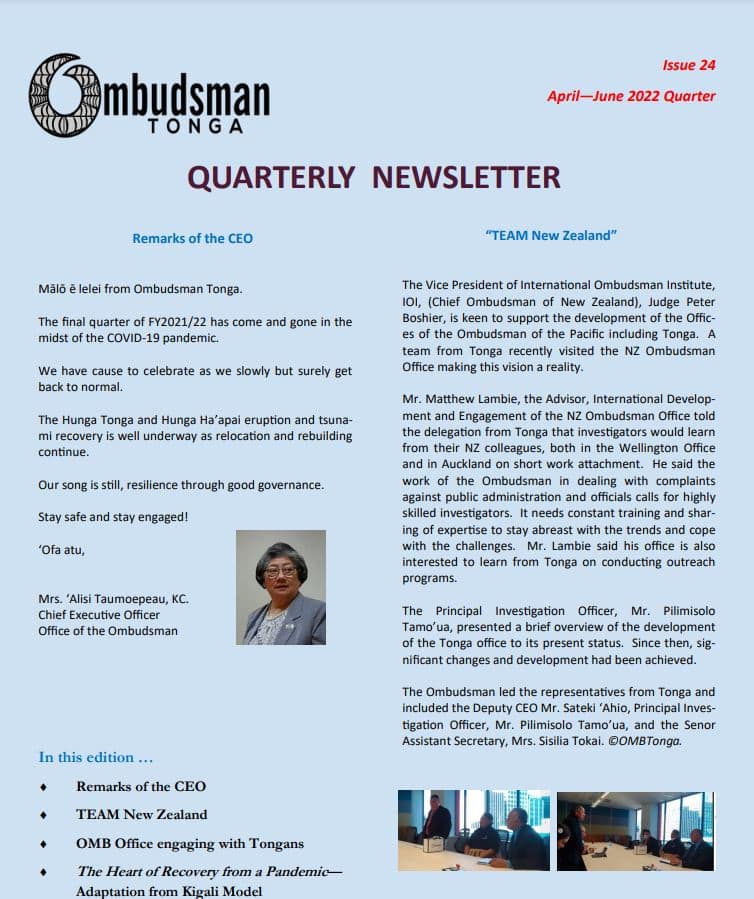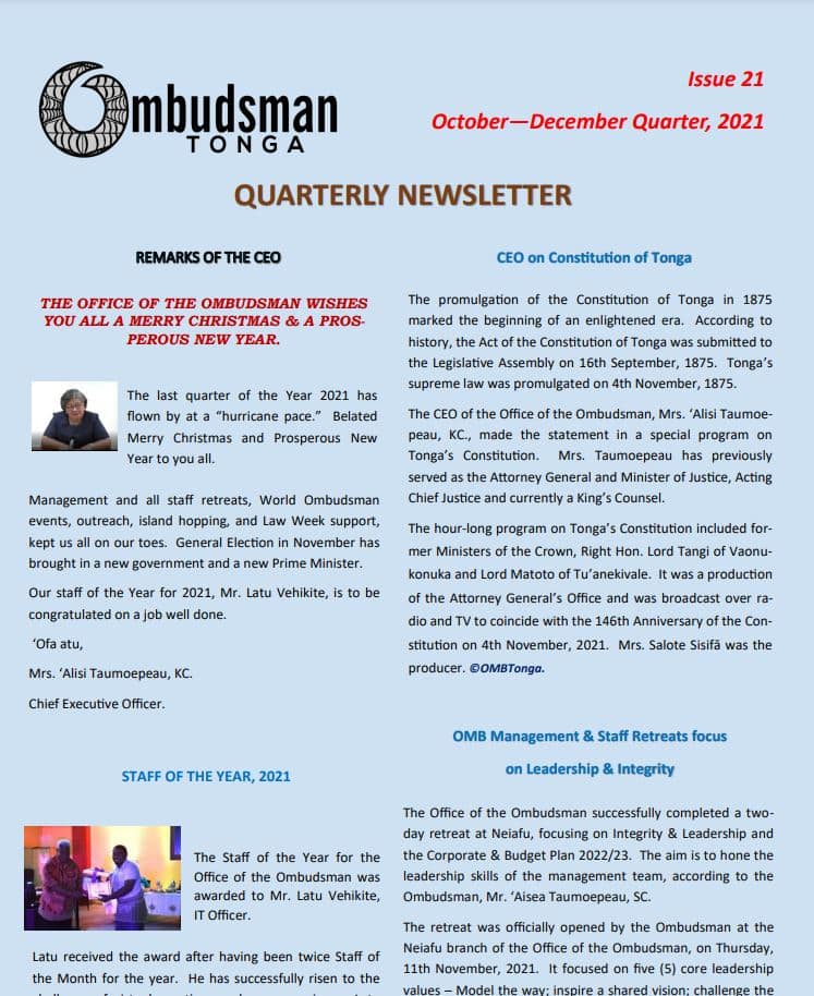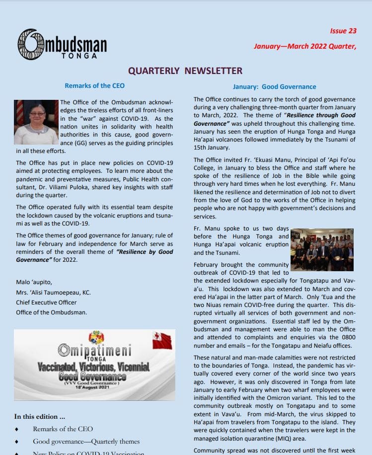 Newsletters Menu Publications Legislation Staff Policy Manual Corporate Reports Annual Reports Corporate Plan and Budget Investigation Reports Court Judgement Ombudsman Reports Communication Reports COVID-19 News Releases Newsletters Speeches Talkback 🔊 Play Our Newsletter 2024 January - March 2024 English Version View Our Newsletter 2023 October - December 2023 English Version View July - September 2023 English Version View April - June 2023 English Version View January - March 2023 English Version View Sanuali - Ma'asi 2023 Fakatonga View Our Newsletter 2022 October - December 2022 English Version View 'Okatopa - Tisema 2022 Fakatonga View July - September 2022 English Version View Siulai - Sepitema 2022 Fakatonga View April - June 2022 English Version View 'Epeleli - Sune 2022 Fakatonga View January - March 2022 English Version View Volcanic Eruption 2022 English Version View Puna 'a e Mo'ungaafi 2022 Fakatonga View Our Newsletter 2021 October - December 2021 English Version View July - September 2021 English Version View Siulai - Sepitema 2021 Fakatonga View Vicennial 2021 English Version View April - June 2021 English Version View