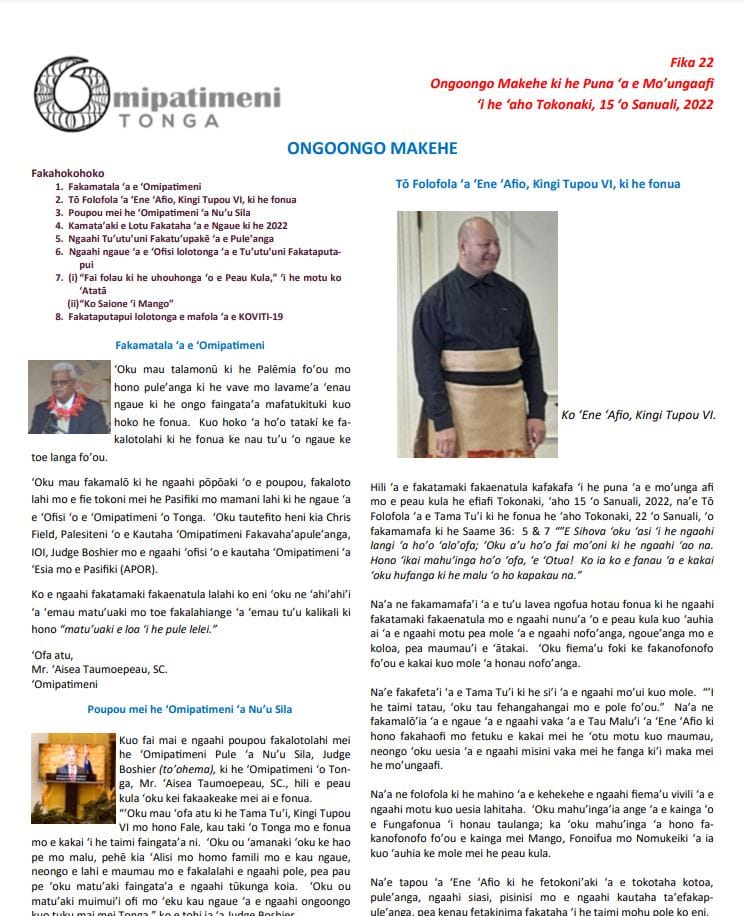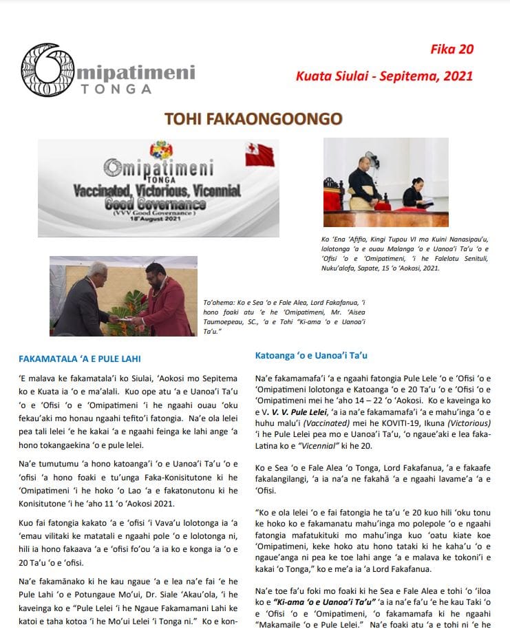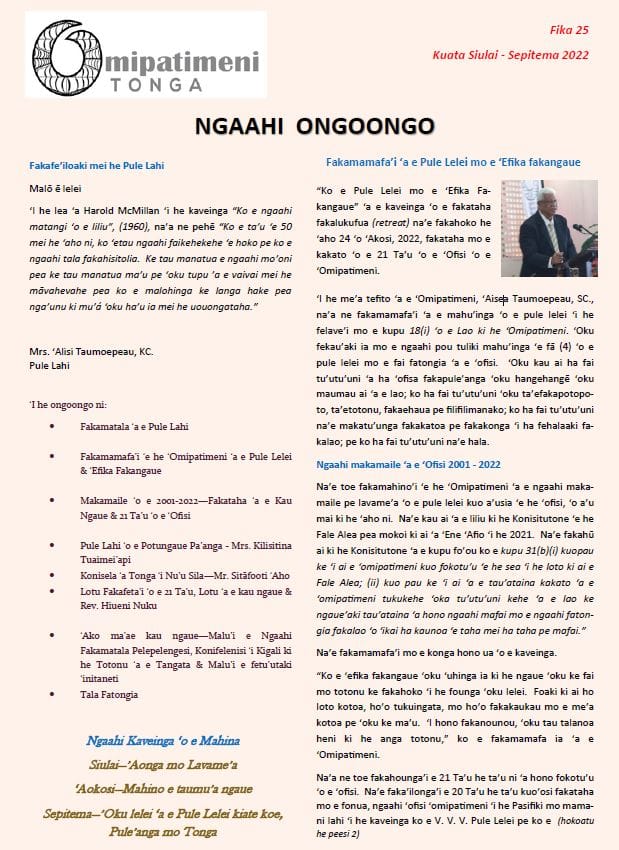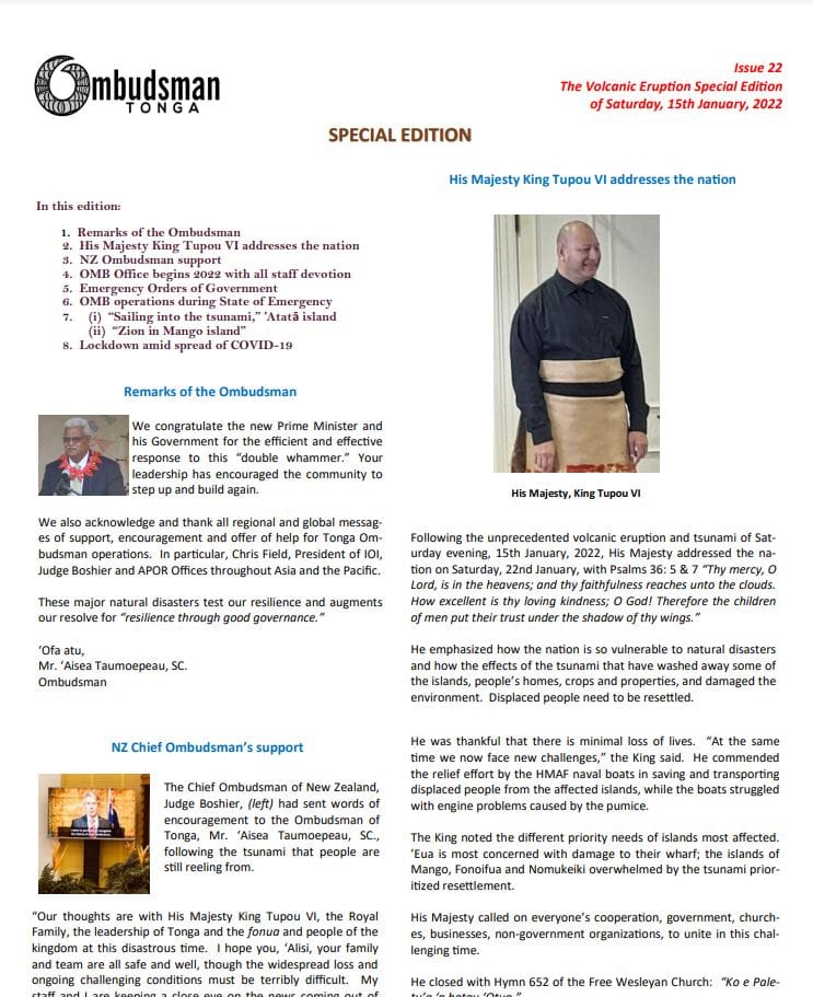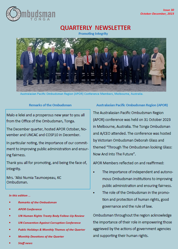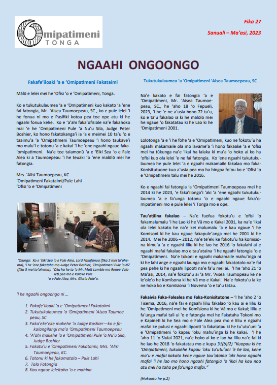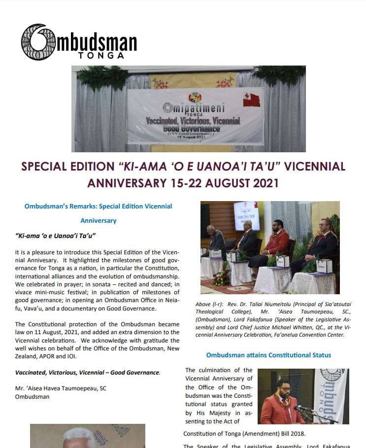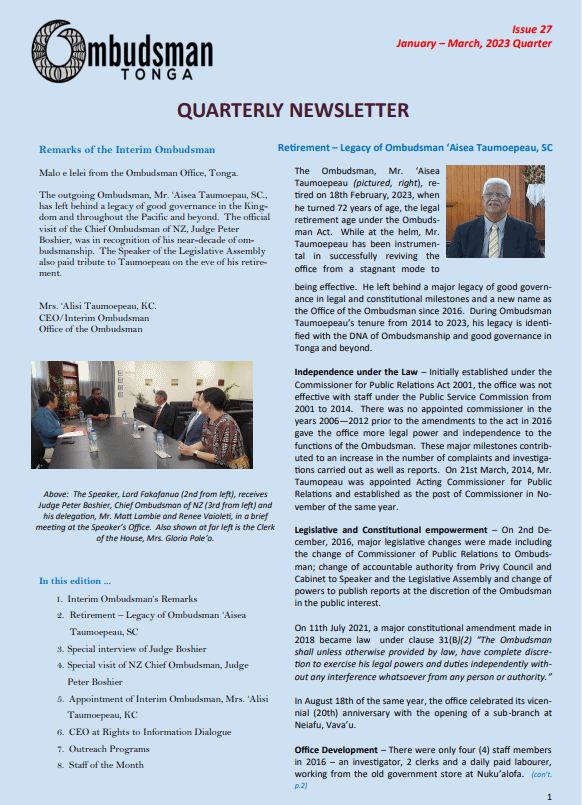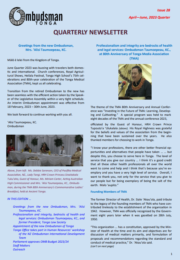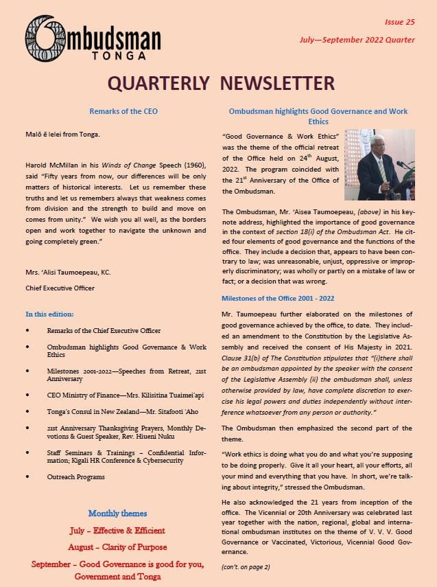 Newsletters Menu Publications Legislation Staff Policy Manual Corporate Reports Annual Reports Corporate Plan and Budget Investigation Reports Court Judgement Ombudsman Reports Communication Reports COVID-19 News Releases Newsletters Speeches Talkback 🔊 Play Our Newsletter 2024 January - March 2024 English Version View Our Newsletter 2023 October - December 2023 English Version View July - September 2023 English Version View April - June 2023 English Version View January - March 2023 English Version View Sanuali - Ma'asi 2023 Fakatonga View Our Newsletter 2022 October - December 2022 English Version View 'Okatopa - Tisema 2022 Fakatonga View July - September 2022 English Version View Siulai - Sepitema 2022 Fakatonga View April - June 2022 English Version View 'Epeleli - Sune 2022 Fakatonga View January - March 2022 English Version View Volcanic Eruption 2022 English Version View Puna 'a e Mo'ungaafi 2022 Fakatonga View Our Newsletter 2021 October - December 2021 English Version View July - September 2021 English Version View Siulai - Sepitema 2021 Fakatonga View Vicennial 2021 English Version View April - June 2021 English Version View